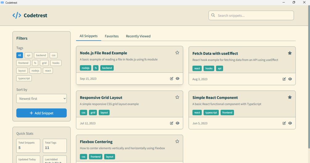 Experience a sleek, modern UI designed for developers and thinkers. Quickly save code snippets, ideas, or anything else — all with full Markdown support. Easily search, tag, and organize your content by date.